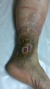 Caused by prolonged inflammation and poor oxygen supply, especially at the inner ankle. These ulcers heal slowly and may persist for months or years.