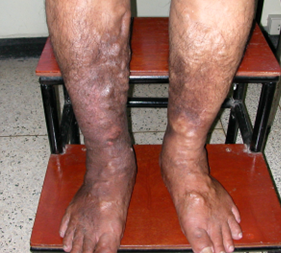 This image shows severe leakage of vein valve cause • visible varicose veins, leg swelling and darkened skin